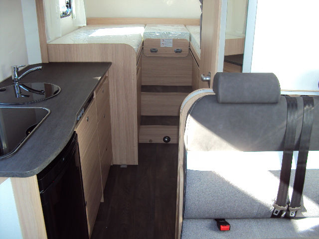Teilintergriertes Wohnmobil mit zwei Längsbetten. Komfortables Fahrzeug für zwei Personen.